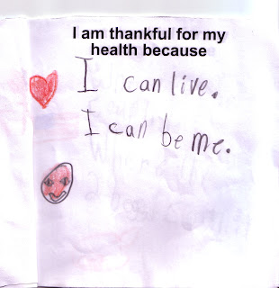 In one room, they made a headdress with brown paper bags and feathers. In another, they made art to symbolize the Pilgrims voyage from England to America. And in another, he made this adorable little booklet, "I am Thankful."